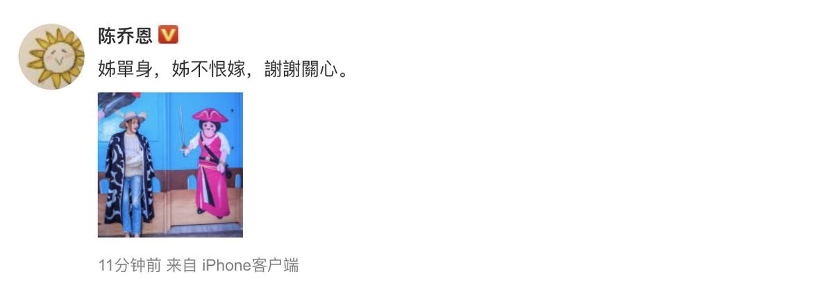 就在大家以为他们好事将近的时候,陈乔恩在微博上辟谣了“姐单身,姐不恨嫁,谢谢关心。”