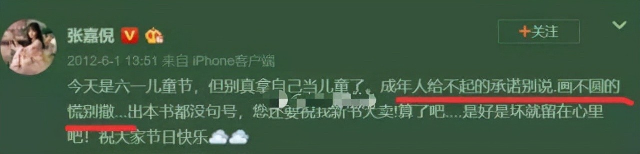张嘉倪此前也在微博上发过一段话“成年人给不起的承诺别说,画不圆的谎别撒”。