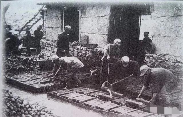 此图为晋察冀根据地兵工厂工人在浇筑手榴弹,仅用于展示手榴弹壳铸造