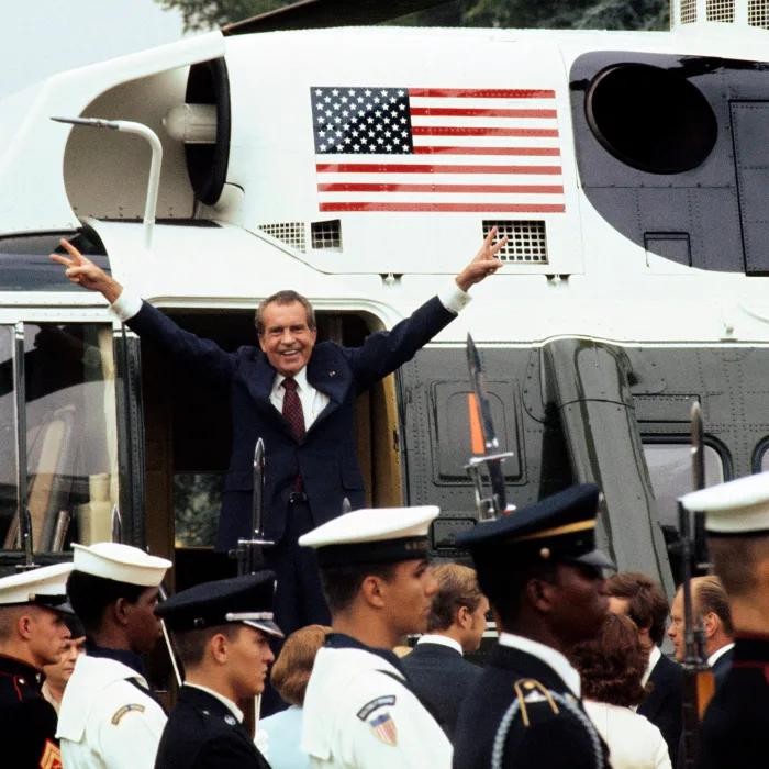 尼克松总统在辞去总统职务后登上白宫直升机。