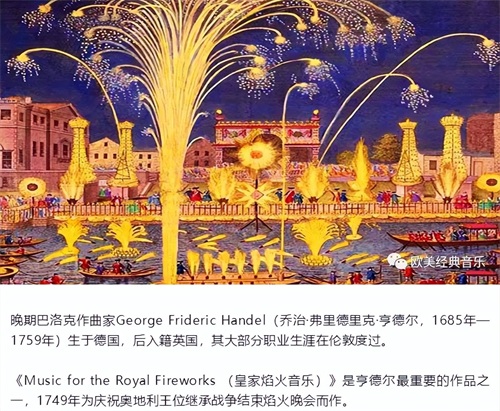 这里,要特别说明的是:1749年,英国皇室准备用一场焰火晚会来庆祝和平——战乱结束,亨德尔受命为焰火表演创作背景音乐,即创作《皇家焰火音乐》,4月27日在绿公园施放焰火时演出。也就是说,《爱克斯·拉·夏贝尔和约》在伦敦签署,标志着“奥地利王位继承战争”的结束。只是在创作这首《皇家焰火音乐》时,国王提出不要弦乐,全部使用管乐器的要求。所以,这是一部由大型管乐队演奏的乐曲。虽然那场焰火晚会搞得很糟糕,燃放烟火时由于火星飞溅,而导致引发了一场火灾,但亨德尔的这部《皇家焰火音乐》却成为了永恒的经典。亨德尔这首《皇家焰火音乐》,是一个时代的辉煌与绚丽。