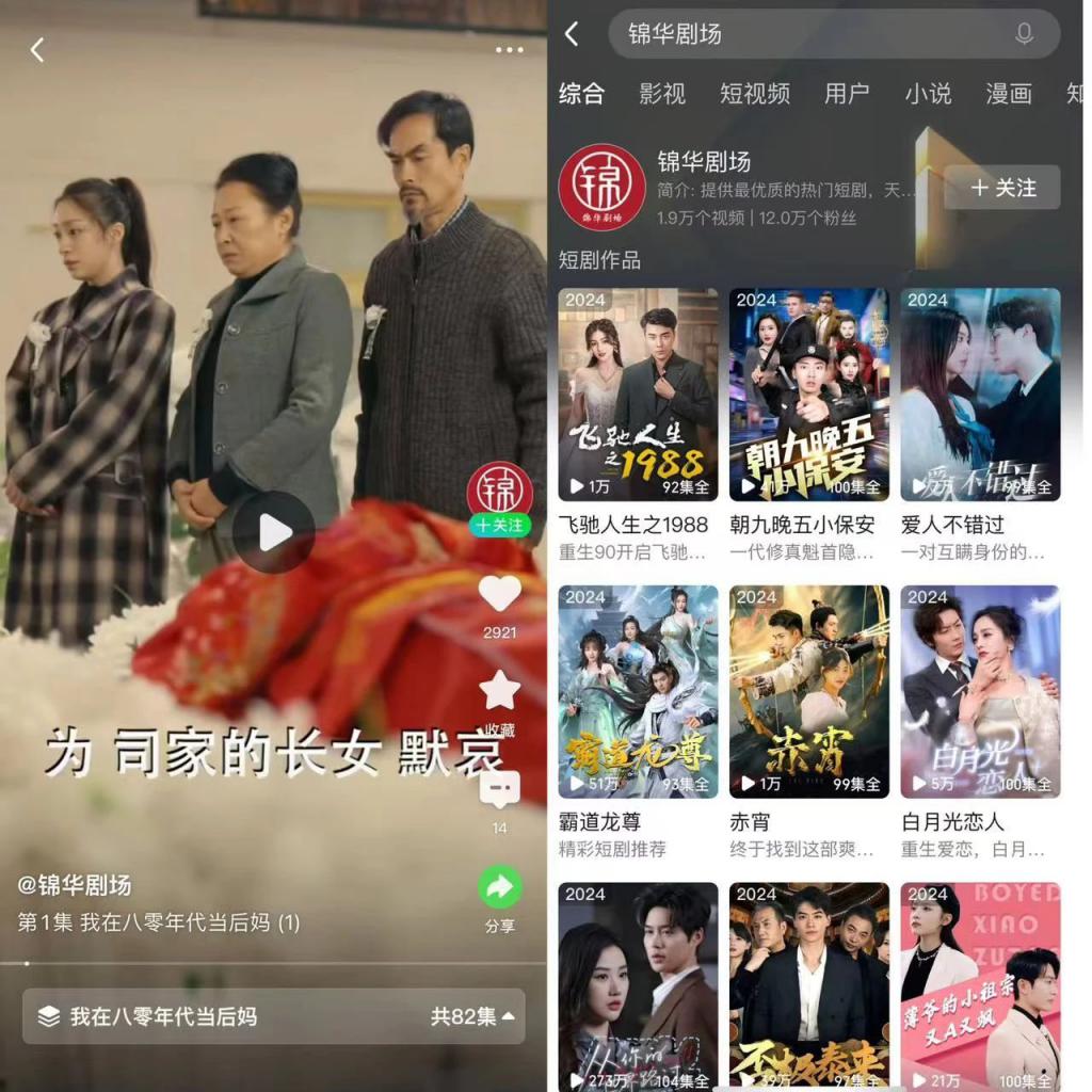 但近期硬糖君发现爱奇艺也上线了《我在八零年代当后妈》,还给出了开屏和首页推荐。该剧被收纳在爱奇艺平台的锦华剧场,该剧场收录了 200 多部微短剧。长视频平台自己不蹚浑水,成为微短剧的分发平台,或许也是一个曲线救国的路子。