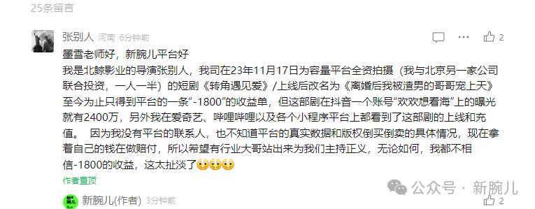 曾有不少短剧投资者诉诸媒体,想要为自己的负收益讨个说法。据新腕儿的报道,一名导演控诉自己的短剧在短视频某账号的曝光有 2400 万,但最后却只有 -1800 的收益。