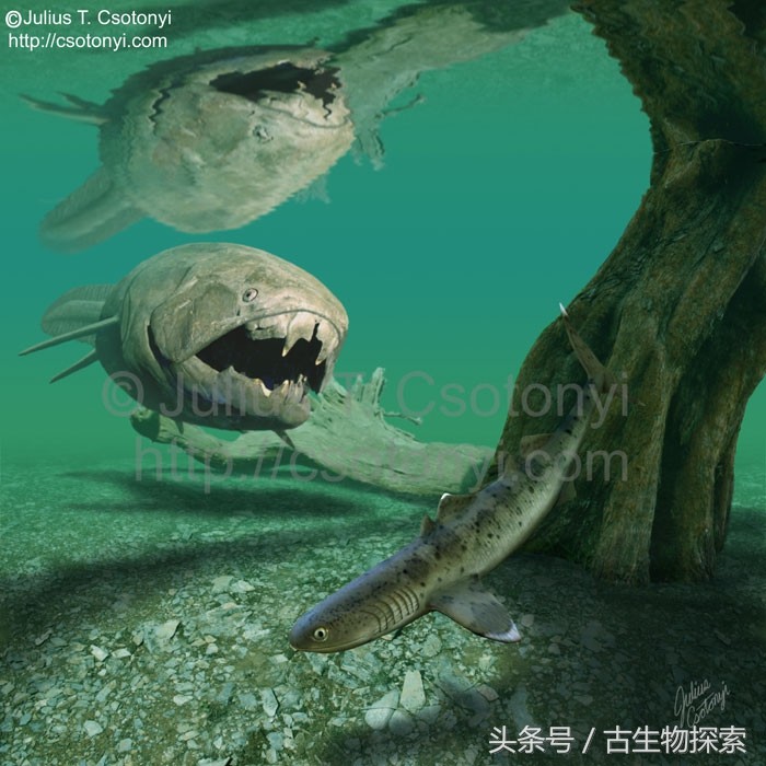 图注:邓氏鱼正在浅水区追踪一条鲨鱼,作者:儒略·斯托尼