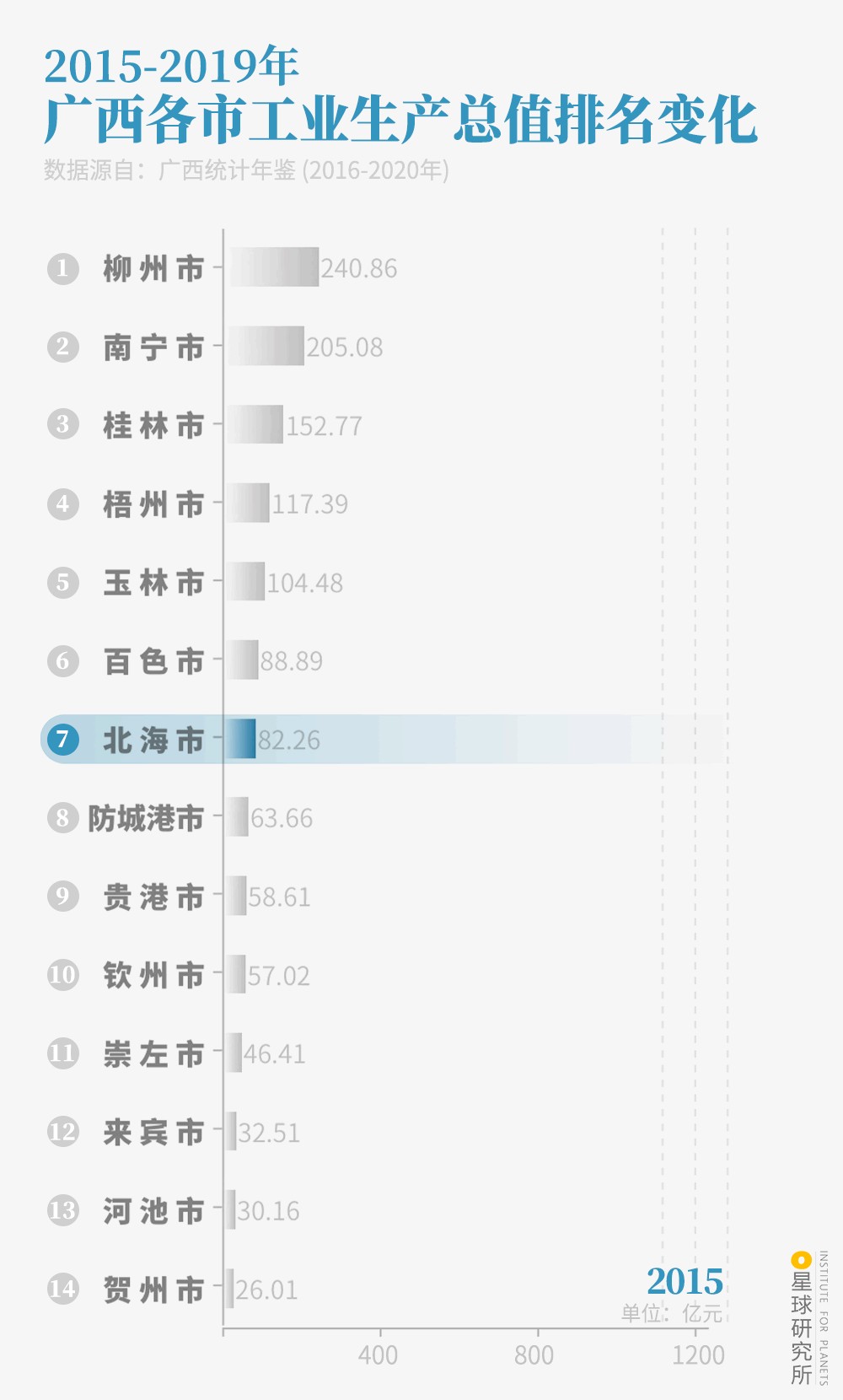 2015-2019年广西各市工业生产总值排名变化| 制图@陈随/星球研究所