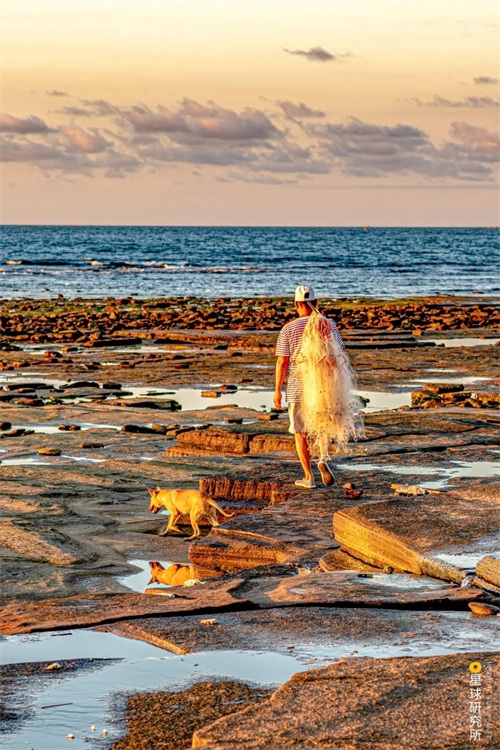 在海滩,人们或在涨潮时尽享碧蓝海水与银色沙滩的快意,或在退潮时奔向滩涂、赶海拾螺,体会北海原住渔民的生活一隅。