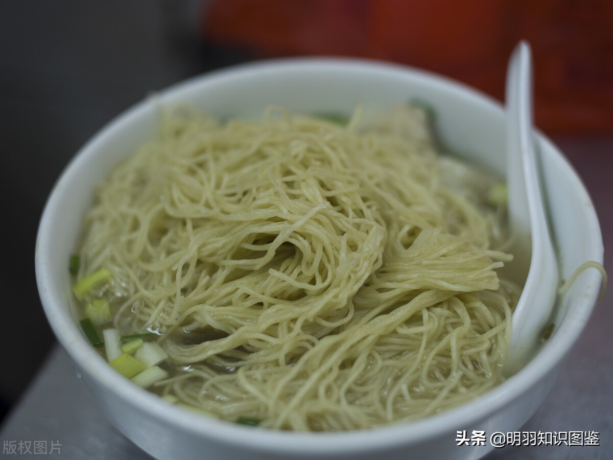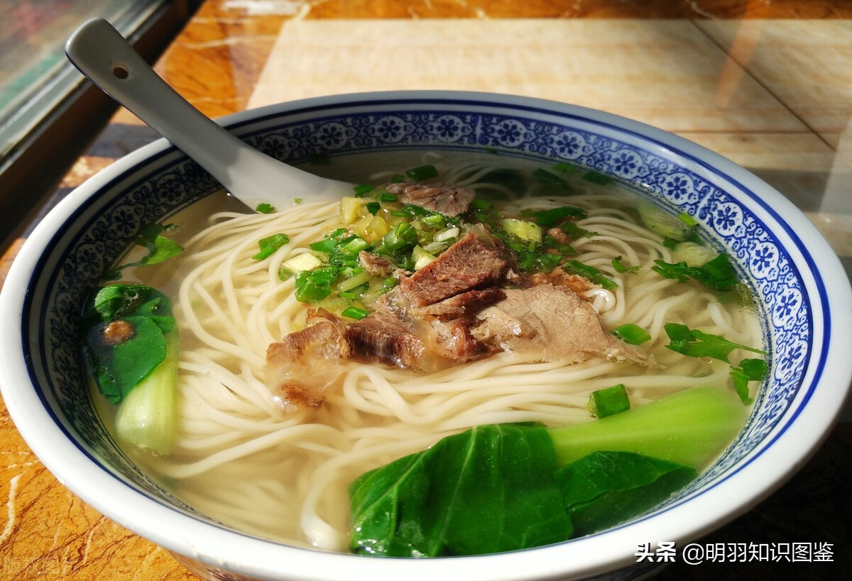 主要以面条、汤、蒜苗、盐、葱做成,汤清味鲜。