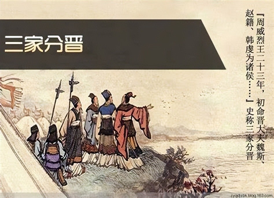 周威烈王二十三年(戊寅,公元前403年),周威烈王姬午封晋国大夫韩虔、赵籍、魏斯为韩侯、赵侯、魏侯,此即‘三家分晋’。三家分晋标志着春秋时代的结束,紧接着是战国时代的来临,本年亦是司马光《资治通鉴》记载起点,司马光还为三家分晋一事,发表长篇感言。在此之前,诸侯们打来打去,好歹是周天子所封的国君,不管谁吞并谁,总是以大欺小、以众欺少的问题,韩、赵、魏三家分晋,却是家臣犯上作乱行为,根本破坏礼仪,以家臣凌驾主子之上。因此,很多史学家认为周天子这一决定,使原本属于打家劫舍的三家分晋有了合法性,认为周天子此举是周室益发破落的关键。时值,周天子作为名义上的天下共主,手上只有几千兵士,保障自身安全都存问题,哪敢掺合诸侯间之事。不管出于什么原因,最终是许了韩、赵、魏三家为侯,也为周王朝灭亡敲响丧钟。