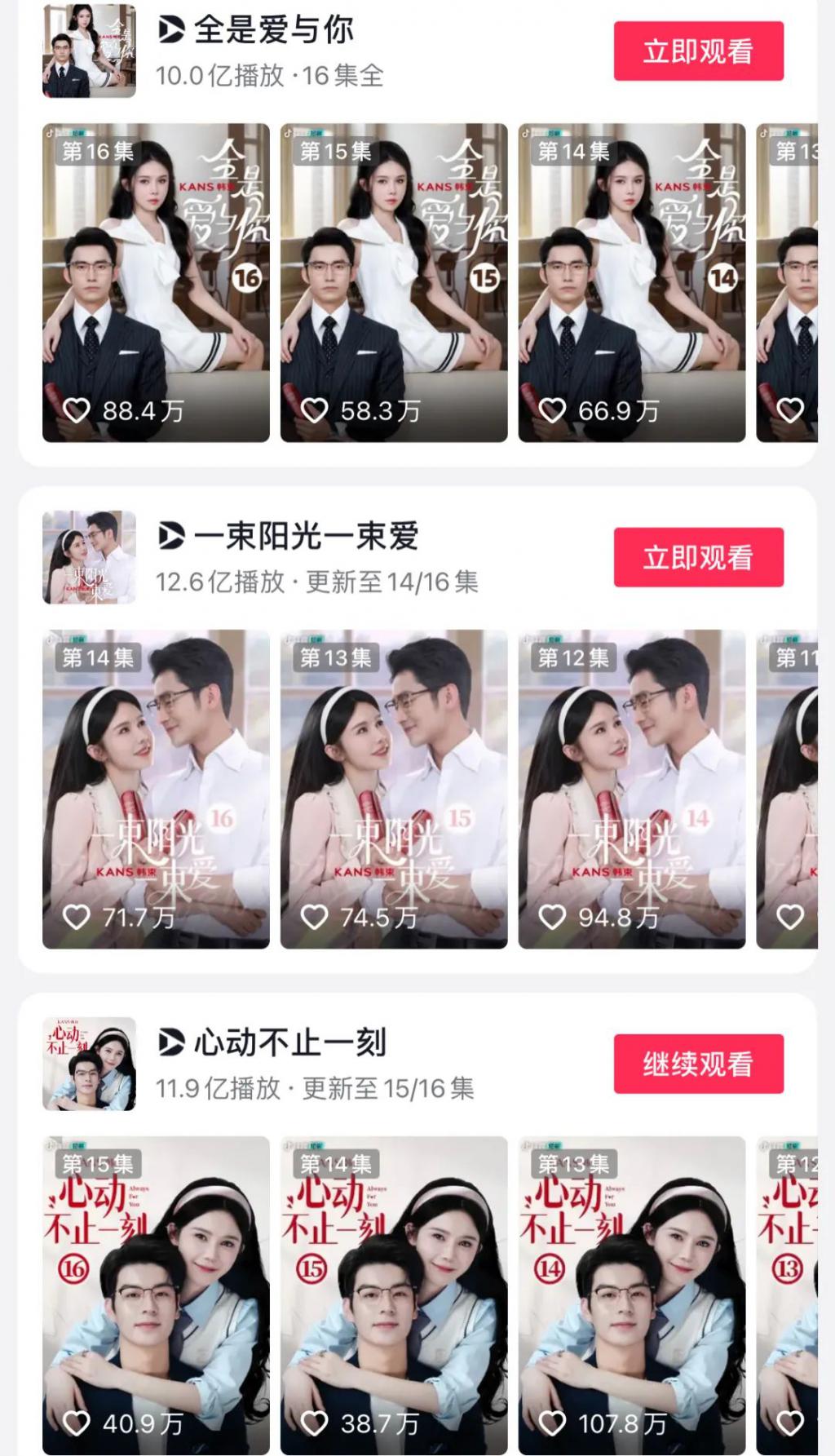 尝到微短剧营销的甜头后,韩束便一发不可收拾,之后又接连与姜十七合作了《心动不止一刻》《一束阳光一束爱》《全是爱与你》《你终将会红》四部微短剧,四部剧集市场表现都超越了《以成长来装束》,单部播放量破 10 亿,累计播放量达到 44.6 亿。算上《以成长来装束》,韩束成功靠五部微短剧撬动了 50 亿的流量。
