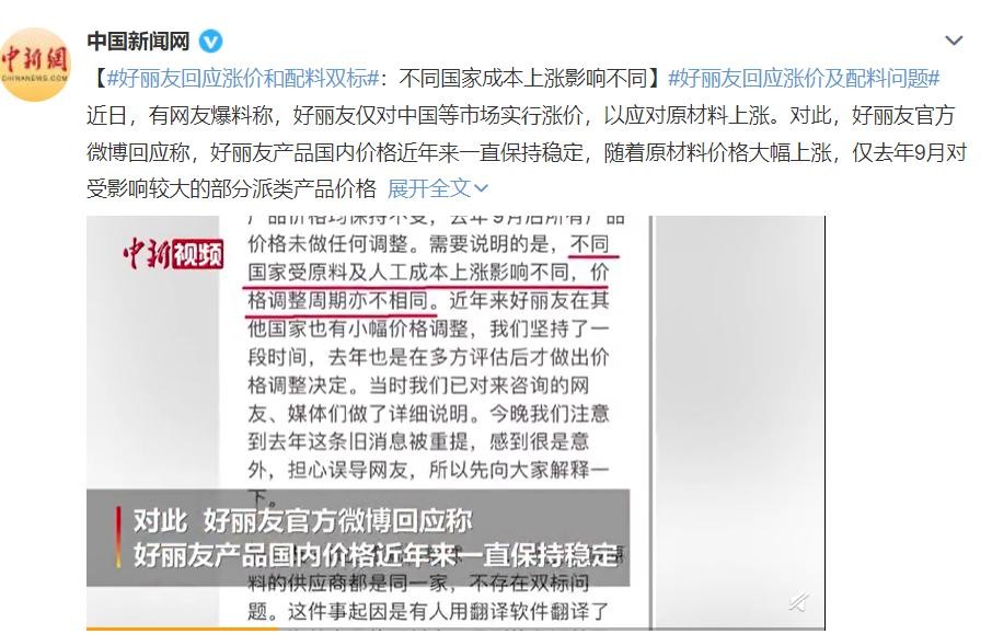 消息一出来,就引发了公众舆论。虽然好丽友很快回应说:价格上涨是一个旧消息,好丽友的主要成分是全球一致的,没有双重标准的问题。博客提到的中韩产品成分表不同,因为翻译软件不准确。