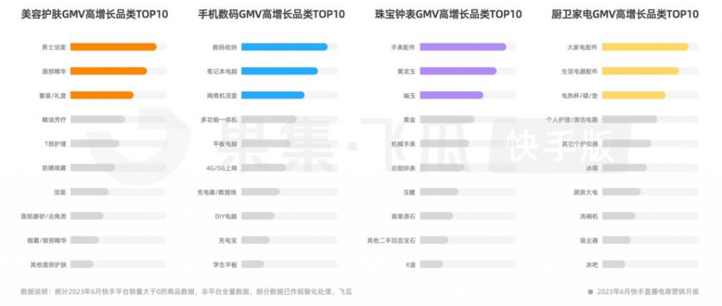此外,快手上的手表配件、黄龙玉、岫玉成为珠宝钟表 GMV 高增长品类 TOP3;电热杯 / 碟 / 垫、冰箱、洗碗机等类目也实现了高速增长。2023 年 Q4,快手老铁用户日均使用快手的时长超过 2 小时,每个月在快手上买东西的老铁人均消费超过 1000 元。