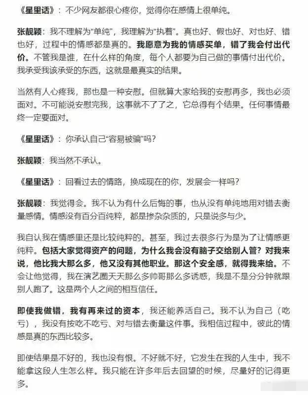 张靓颖对此回应表示“我没有按吃不吃亏、对与错去衡量这件事。我相信过程中,彼此的情感是真的东西比较多。即使结果不好,我也没有恨。不好就不好,它发生在我的人生中,我不能拿这段人生怎么样”。