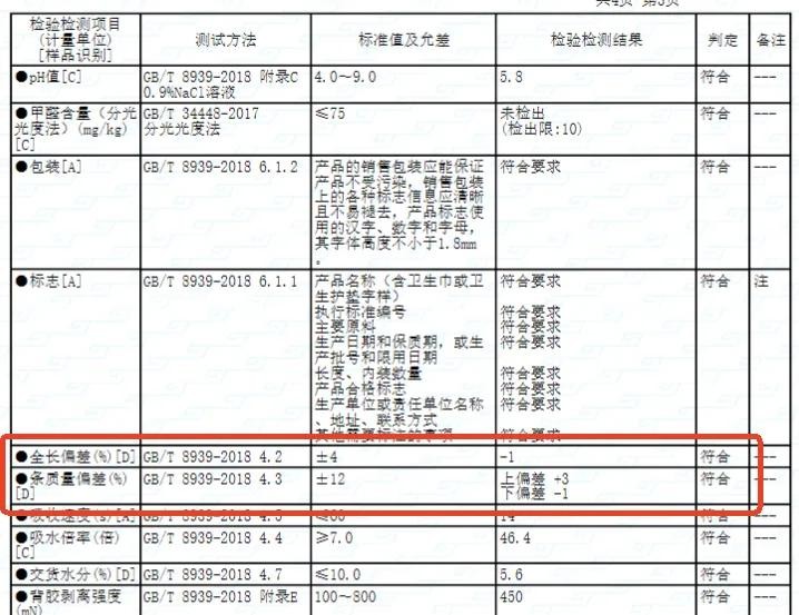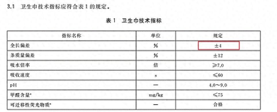 记者从公开资料发现,由国家市场监督管理总局、中国国家标准化管理委员会发布的现行国家标准《卫生巾(护垫)(GB/T 8939-2018)》规定:卫生巾的全长偏差在±4%,全长偏差=(平均值-标称值)/标称值×100%。试验方法为,用直尺测量试样的全长(从试样最长处量取),准确至1mm。