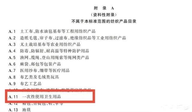记者注意到,《规范》附录A列出的“不属于本标准范围的纺织产品目录”中,“一次性使用卫生用品”在列。