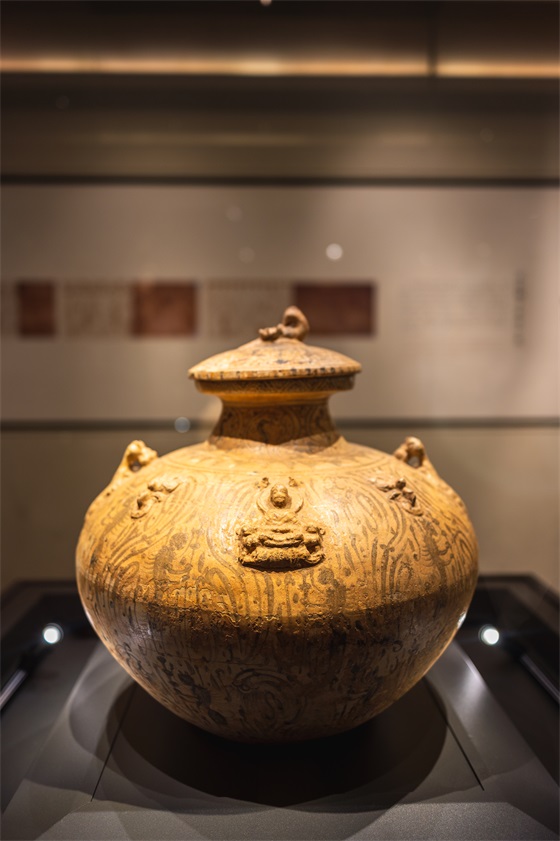 在这千余件文物中,不乏极其重要的珍贵文物,比如蝉纹金珰、玻璃杯、青瓷堆塑人物楼阙魂瓶、青瓷鸡首壶、青瓷莲花尊、青瓷釉下彩羽人纹盘口壶、铜造佛像等。