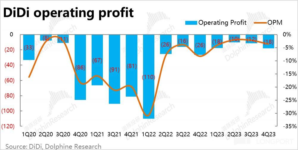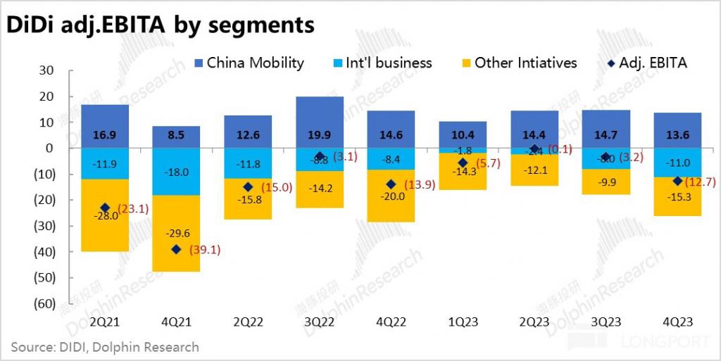 同时海外和新兴业务的亏损幅度本季有明显的扩大,本季海外业务 EBITA 亏损继续扩大到 11 亿。其他创新业务的 EBITA 亏损也扩大到了 15.3 亿。两者合计亏损接近核心国内出行业务盈利的两倍,可谓是触目惊心的。