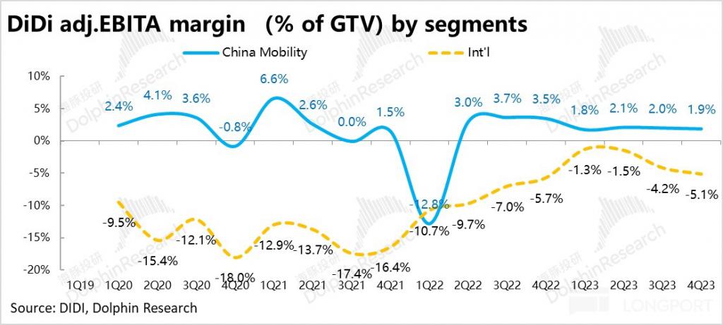 因此,在司机分成减少和乘客激励的增长大体对冲后,四季度滴滴国内出行业务的盈利水平环比略有下降,调整后 EBITA 利润率占 GTV 比重由 2% 环比下降到了 1.9%。绝对额由 14.7 亿下降到 13.6 亿,无惊无喜。