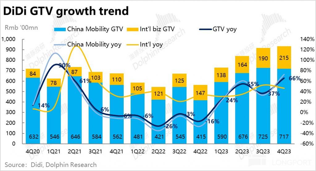 照例先看最关键的运营数据,继三季度滴滴国内成交额(GTV)成功走出疫情和下架的影响创出历史新高后,四季度国内出行 GTV 环比略微滑落 1.1% 到 717 亿,结合历史情况,4Q 相比 3Q 略有下降属于常规的季节性波动。由于去年基数的巨大波动,使得大增的同比增速参考意义不大。