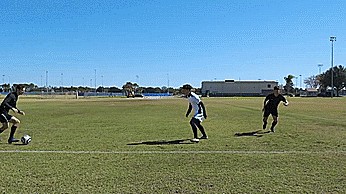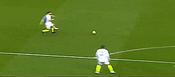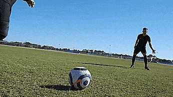 例如,下面场景,我们必须在队友越位之前把球踢出去,这样我们根本没有时间调整到脚内侧或者换脚。