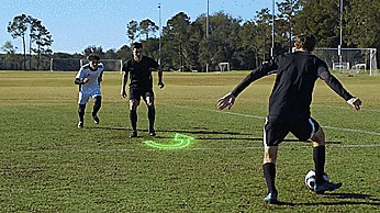 举个例子,在下面场景下,如果我们把球传到队友的右脚,那么我们就会给防守队员一个更好的机会去抢球,因为防守队员是从那边压迫的。
