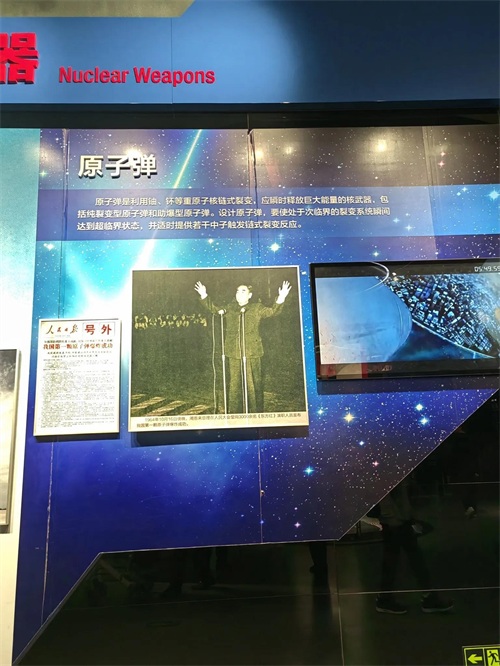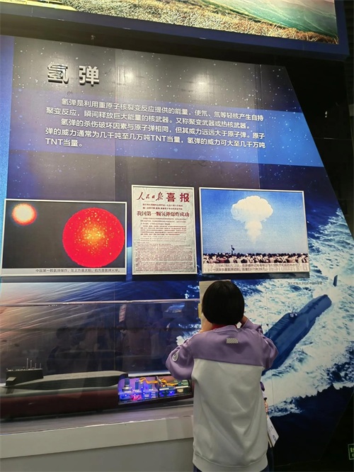 在“核武器与核技术和平利用”展厅,我看到了中国核武器从一无所有到全面开花的创建之路;我看到了中国第一颗原子弹爆炸成功时,周恩来总理向全世界宣布时的喜悦和自豪;我也看到第一颗氢弹爆炸成功时巨大耀眼的火球盖过太阳的光辉。中国是一个热爱和平的国家,核武器是维护国家主权和安全的战略基石。中国承诺任何时候、任何情况下都不首先使用核武器,无条件不对无核国家和无核地区使用和威胁使用核武器。中国核安全观是:发展和安全并重,权利和义务并重,自主和协作并重,治标和治本并重。