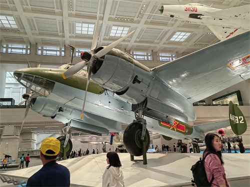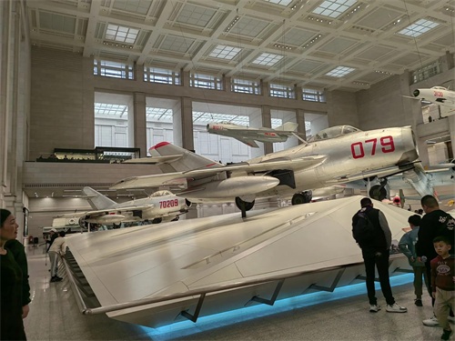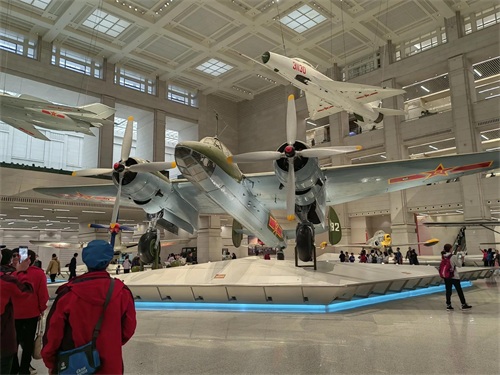 我随着参观的人群进入了大厅中间的兵器陈列厅,瞬间让我惊呆了。这里仿佛是一座飞机场,地上空中停着挂着各式各样的飞机,有大有小,这些飞机都不是普通的飞机,它们有的是身经百战的英雄战机,有的是从敌人手中缴获的战利品,有的是原国民党空军飞行员从台湾飞回大陆的飞机等,它们的身后都有一段不平凡的历史。如编号为079的银灰色战鹰,就是著名的战斗英雄王海驾驶过的米格―15歼击机。飞机上的九颗红五星标志着王海在抗美援朝战争中的战绩。而那架编号为03,机身上印着红五星,上面写着“八一”字样的美国造的“野马”战斗机,则是解放战争后期从国民党手中缴获或接收的战机,这批机在开国大典中,由新组建的中国人民空军第一支飞行中队驾驶飞越天安门上空,接受党和国家领导人的检阅。