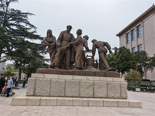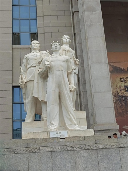 出了地铁站,首先映入眼帘的是一座独特的建筑,外观呈“山”字型,上部有两层塔座,塔顶上为红色耀眼的军徽,这就是中国人民军事博物馆。宽阔的广场上有两座大型雕像,博物馆门口前两侧各有5门火炮,看介绍,这些火炮都是1840年以来中国人民抗击侵略者使用的大炮,每门火炮都有故事,有的曾经安置在虎门炮台,接受过林则徐的检阅;有的曾居大沽口,英勇抗击八国联军的入侵,这些火炮见证了先辈军人的英勇与悲壮,同时提醒我们,落后就要挨打的耻辱。军事博物馆正门上方的位置,悬挂着由毛主席亲笔题写的“中国人民革命军事博物馆”金字铜底巨匾,大门两侧则竖立着两组汉白玉石雕,分别为陆海空三军战士和男女民兵。