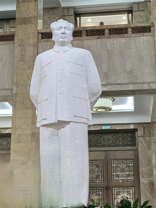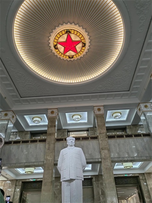 进入军事博物馆大厅,一座毛主席的汉白玉雕像顶天立地,与大厅天花板上的红五星相互呼应,格外醒目,毛主席带领中国人民翻身得解放,他是中国人民的大救星。