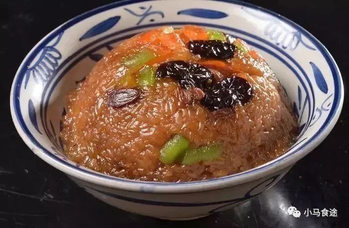 2.蒸碗中可以加入几个去核的大枣,葡萄干、猕猴桃果干点缀一下,将拌好的糯米装入蒸碗中,上锅蒸熟,出锅反扣盘中,淋上蜂蜜白糖勾的玻璃芡更好看。