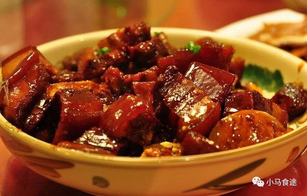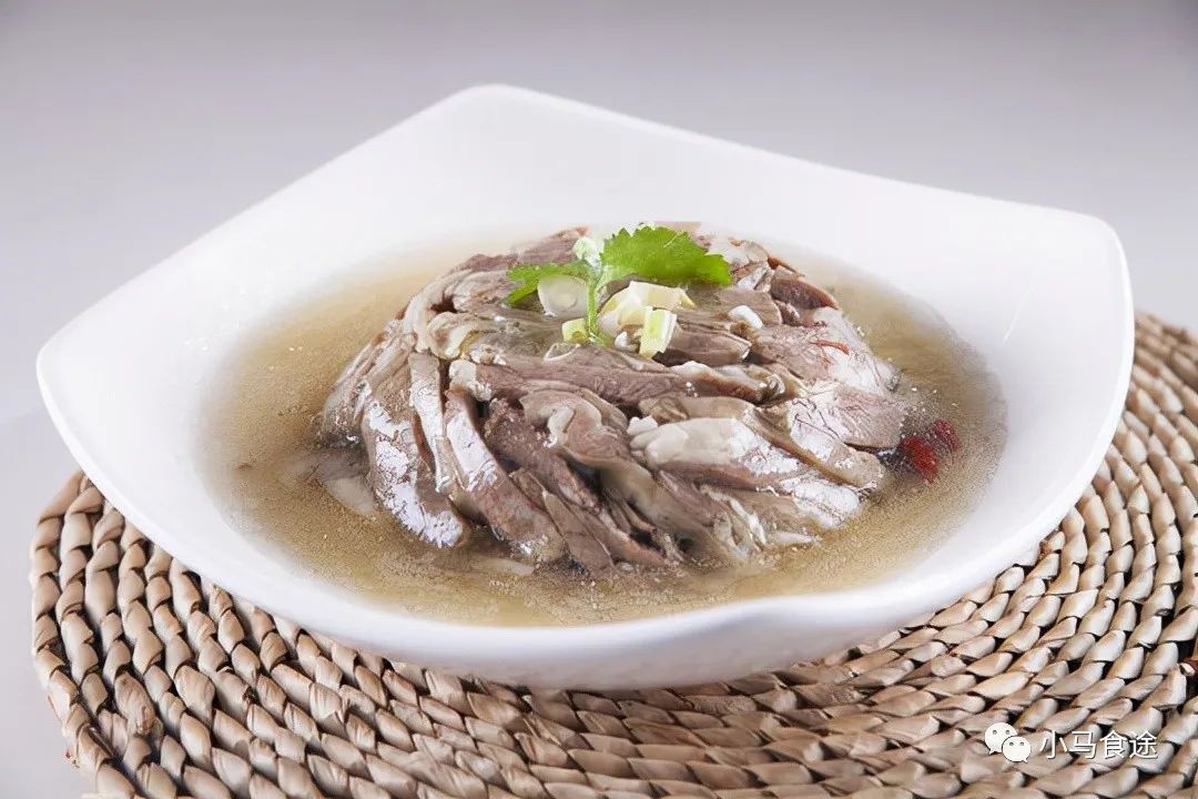 3.将肉块捞出切成约1厘米厚的大片,摆入蒸碗,浇上同上熬好的料水,上锅蒸1小时以上即可出锅装盘,汤汁勾薄芡淋在肉上即可。