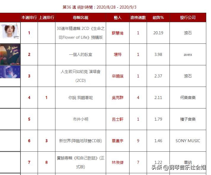 本期成为冠军销量的专辑是《生命之花 FLOWER of life 》,这张专辑的本期销售占比占全部专辑的百分之20的份额。可以看出苏慧伦这位女歌手在流量小生当红的年代,仍然可以凭借自己的音乐作品在乐坛有一席地位。