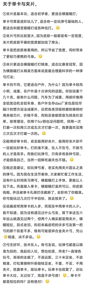 点评:这段话说得没有问题,夹片圆头弹弓上手快打准较易,单卡弹弓上手慢打准较难。