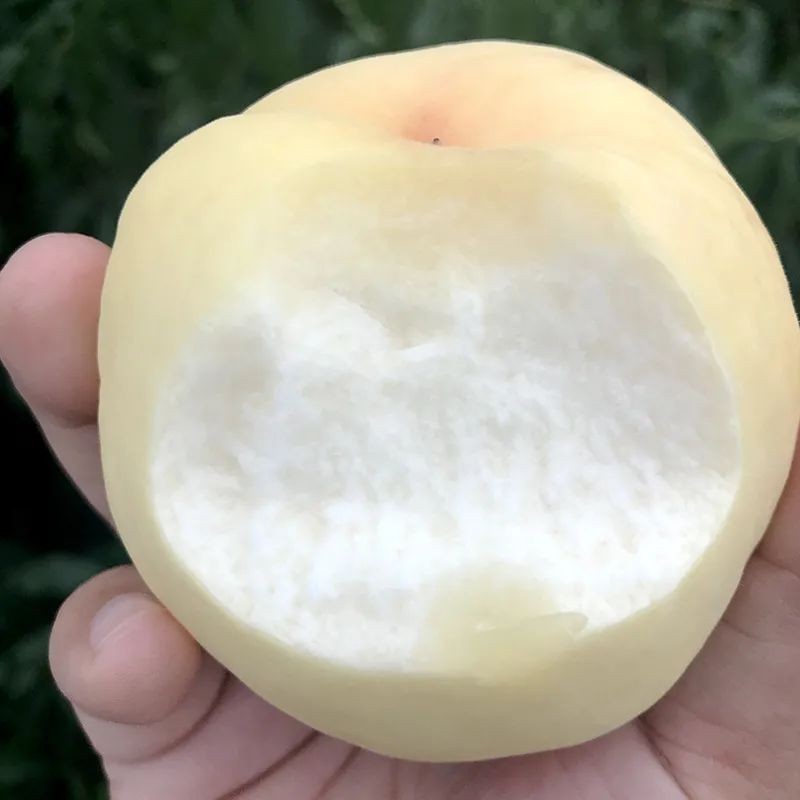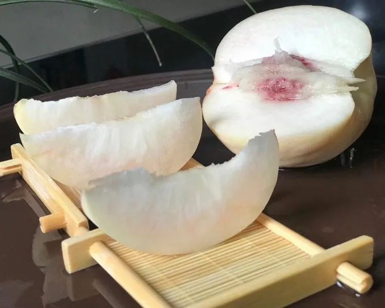 完全成熟的大白桃,奶白色的果肉如同凝脂,细腻无渣。