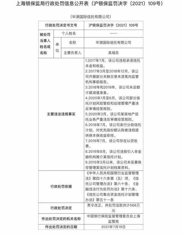 公开信息查询该信托公司违约除了房地产方面以外还看到一些违规处罚:21年7月28日,上海银保监局公布的行政处罚信息显示,华澳国际信托有限公司因9项违规行为被处罚款566万元,时任华澳国际信托有限公司副总裁杨伟琳因对违规行为负有直接管理责任被警告。