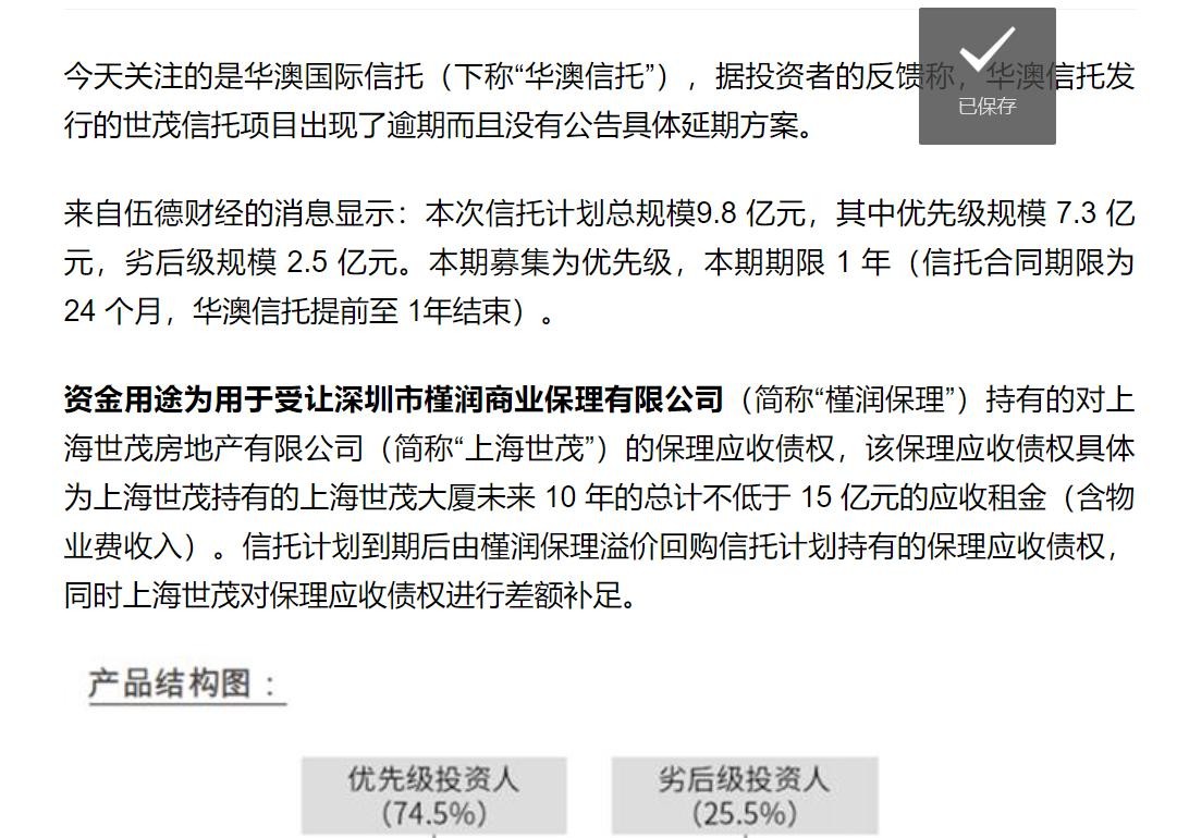 那随着世茂现金流紧张,这个项目也没有按期兑付,但是随着今日国家对房产行业的大力支持,世茂也官宣定增补充现金流,相信会被解决。