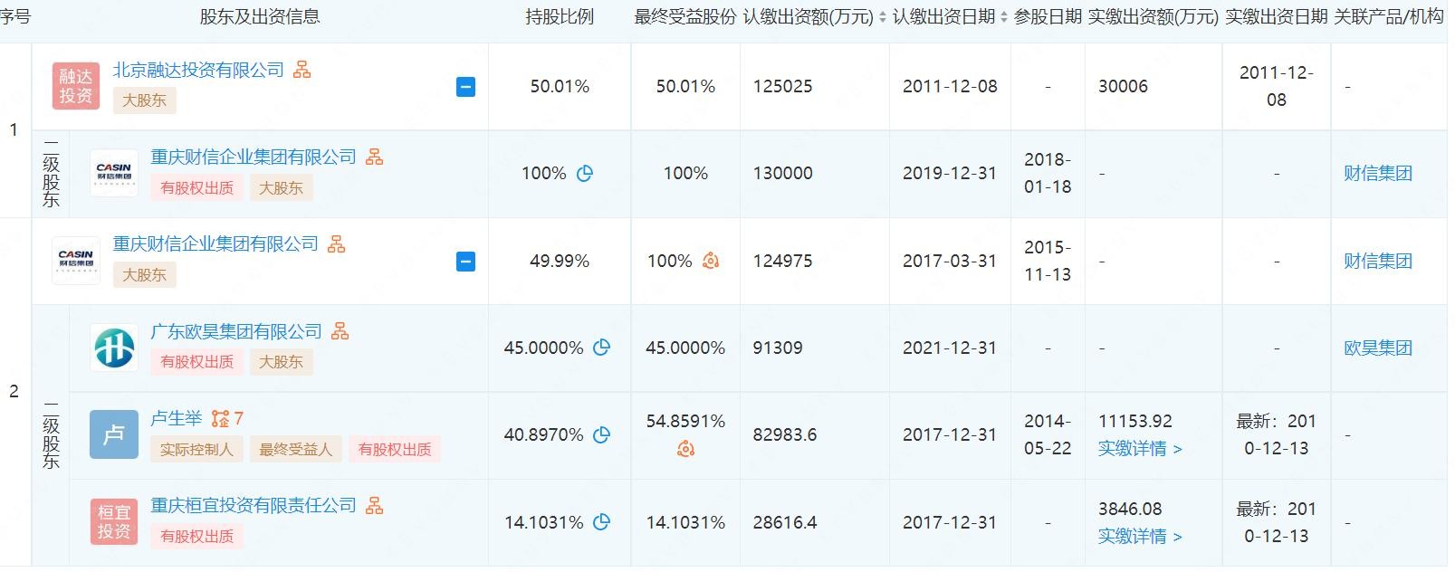 北京融达投资有限公司持股 55.01%;实际控制人为重庆财信企业集团有限公司