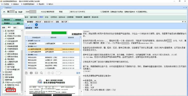可本地部署说来简单,这背后又是如何实现的呢?“领导意识靠前、算力足够、技术实力能突破、有应用场景和互联网医院基础等,这几个因素不可或缺。”医院信息数据部主任曾霞指出,医院将私有deepseek-r1:70b大模型与电子病历系统进行封装对接,在门诊电子病历和住院电子病历界面增加“DeepSeek智能应用”菜单,能让医务人员快速、安全地调用大模型,并充分利用DeepSeek大模型在医疗领域的推理、分析能力进行病情分析、报告解读、诊疗方案推荐等。