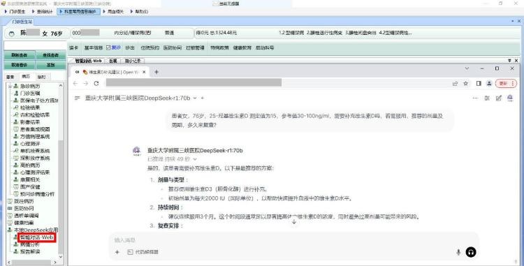 这样的场景已渗透至该院各环节。重庆大学附属三峡医院本地部署完DeepSeek后,又迅速在互联网医院推出“DeepSeek智能应用”,包括智能导诊、报告解读、用药指导等功能。