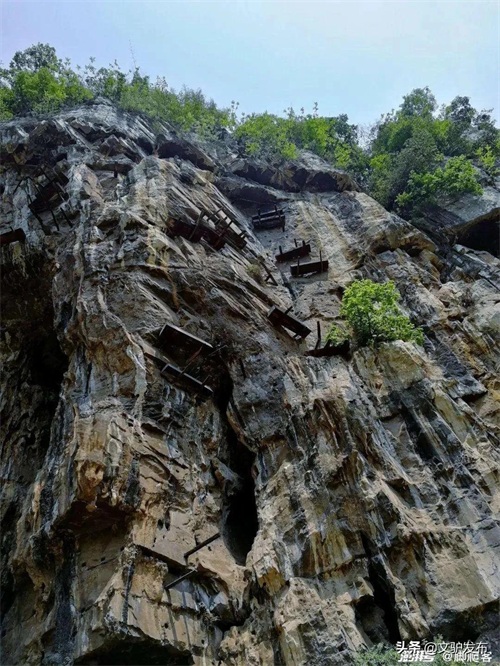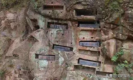 悬棺葬是一种奇特的葬俗,在中国古代南方一些民族中,行此葬式者居多,利用人迹罕至的悬崖绝壁放置棺木,如悬在半空,统称为悬棺。其悬置方式大体可分为四种:在岩壁凹人处凿孔嵌木桩,架棺于上,名“岩桩式”;利用天然岩穴将棺木半藏或全置于穴内;利用天然岩缝架木梁,沿隙置棺于木梁上;在岩壁开凿棺穴,置棺于穴内并封口。后三种类型多见,唯有“岩桩式”悬棺奇特罕见,被称为千古之谜。