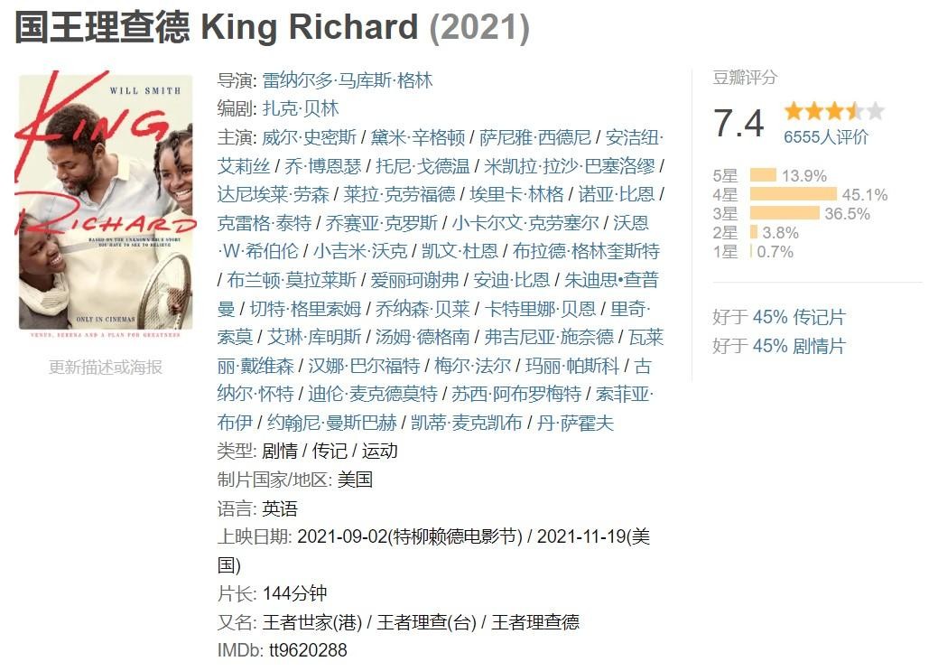 史皇归来!并且根据真人真事改编,可以说是美国版《摔跤吧!爸爸》。本片讲述的是一位没有任何网球背景的父亲,培养出了两位网球巨星——维纳斯·威廉姆斯和塞雷娜·威廉姆斯(大威小威)。