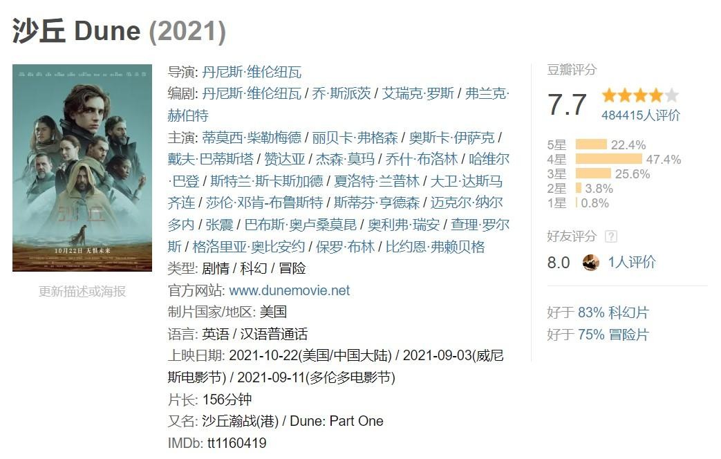 去年国内上映的好莱坞巨制,原著小说在科幻界有着比《三体》更早且更广泛的盛誉。由神导维伦纽瓦操刀,甜茶、海王、灭霸、蜘蛛侠女友等一众好莱坞一线演员,且有汉斯·季默作曲恢弘大气,妥妥的视听盛宴。