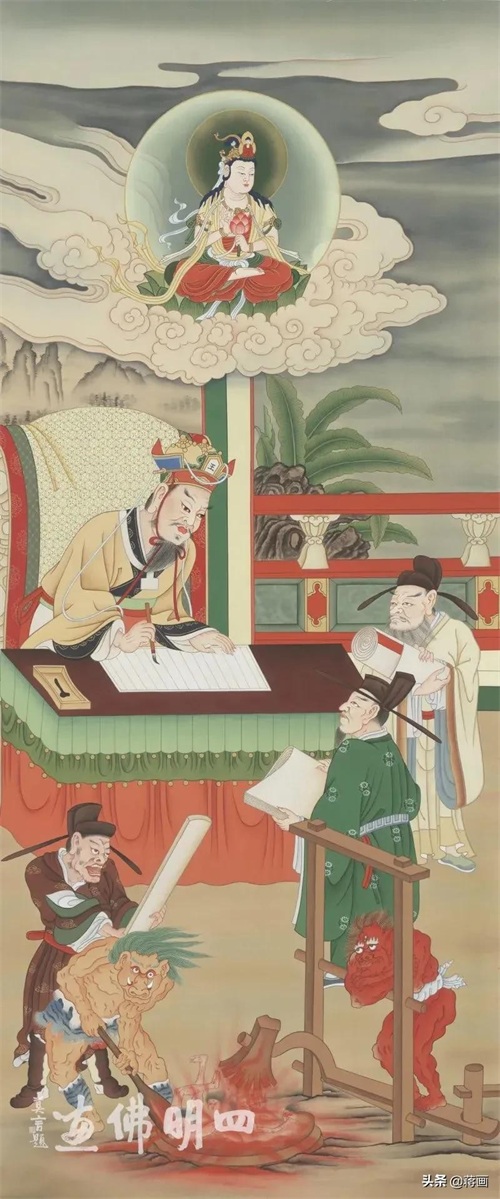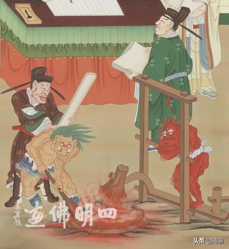 上图讲述亡者百日,历经苦难来到平等王殿,狱卒将亡者置于臼中,施与百般酷刑与折磨。图中最顶端的观音菩萨,被视为第八殿平等王的本地佛形象出现。