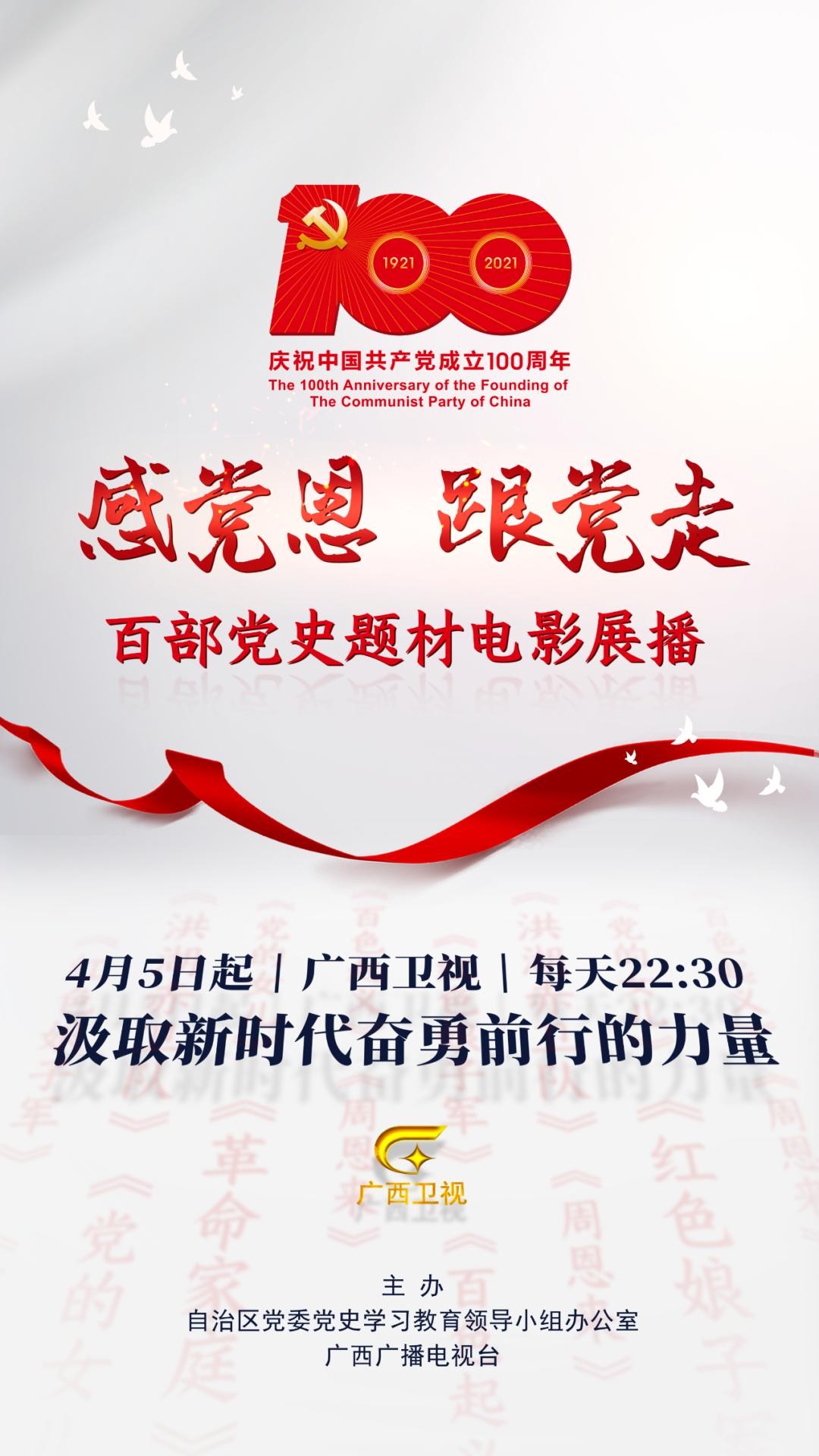 为了大力弘扬党的光荣历史,在中国共产党成立100周年之际,自治区党委党史学习教育领导小组办公室、广西广播电视台联合主办,在广西卫视开展“感党恩跟党走”百部党史题材电影展播活动。
