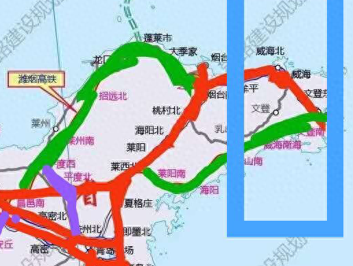目前威海市境内只有荣青城际一条高铁线路开通,但是沿着这条高铁可以让威海沿线到达烟台市之后南下青岛,或者是经过青荣城际转到青济高铁线上,然后经过济南到达全国各地城市。从下图可以看出威海市的大致高铁方向,注意想看详细的路线要看国家发布的,下图仅仅表示大致方向,不代表实际为位置。(红色是已通高铁线路,紫色是待建设的高铁线路)
