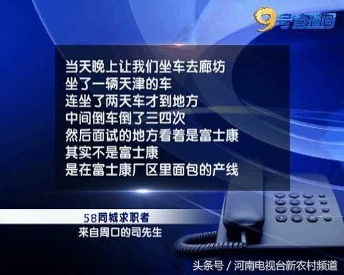 在系列报道《58速聘,涉招工骗局》播出后,受到了广泛的关注,有很多在58同城上找工作上当受骗的求职者向我们的热线反映问题。今天的节目中,我们也从中抽取了几位受骗的求职者,进行了电话采访,一起来听听他们是怎么说的。