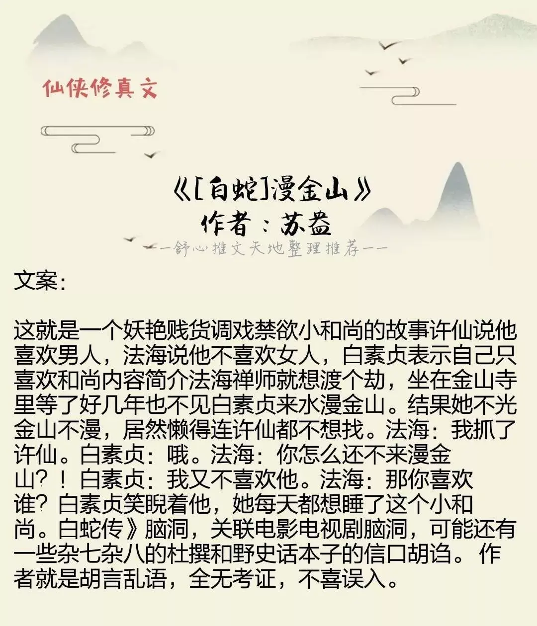 书评:这篇文蛮好看的呢,可能是我看过最好看的法海白蛇同人文了,这个作者真的很不错,妖娆白素贞VS安静法海裴文德,女追男,轻松搞笑甜蜜,白蛇传的脑洞。白素贞是穿越来的,特别洒脱那种性格,对许仙不感冒,一心只想过着妖精自由自在的惬意生活。男主法海一心想让白素贞找许仙走剧情,自己了却前缘飞升成仙。俩人一个撩一个愁,看的少女心满满。另外,各种降妖伏魔的剧情也很精彩。这篇还有小青的感情线,是和财神身边的童女一对。能吃进去这种CP设定的可以看看哈~