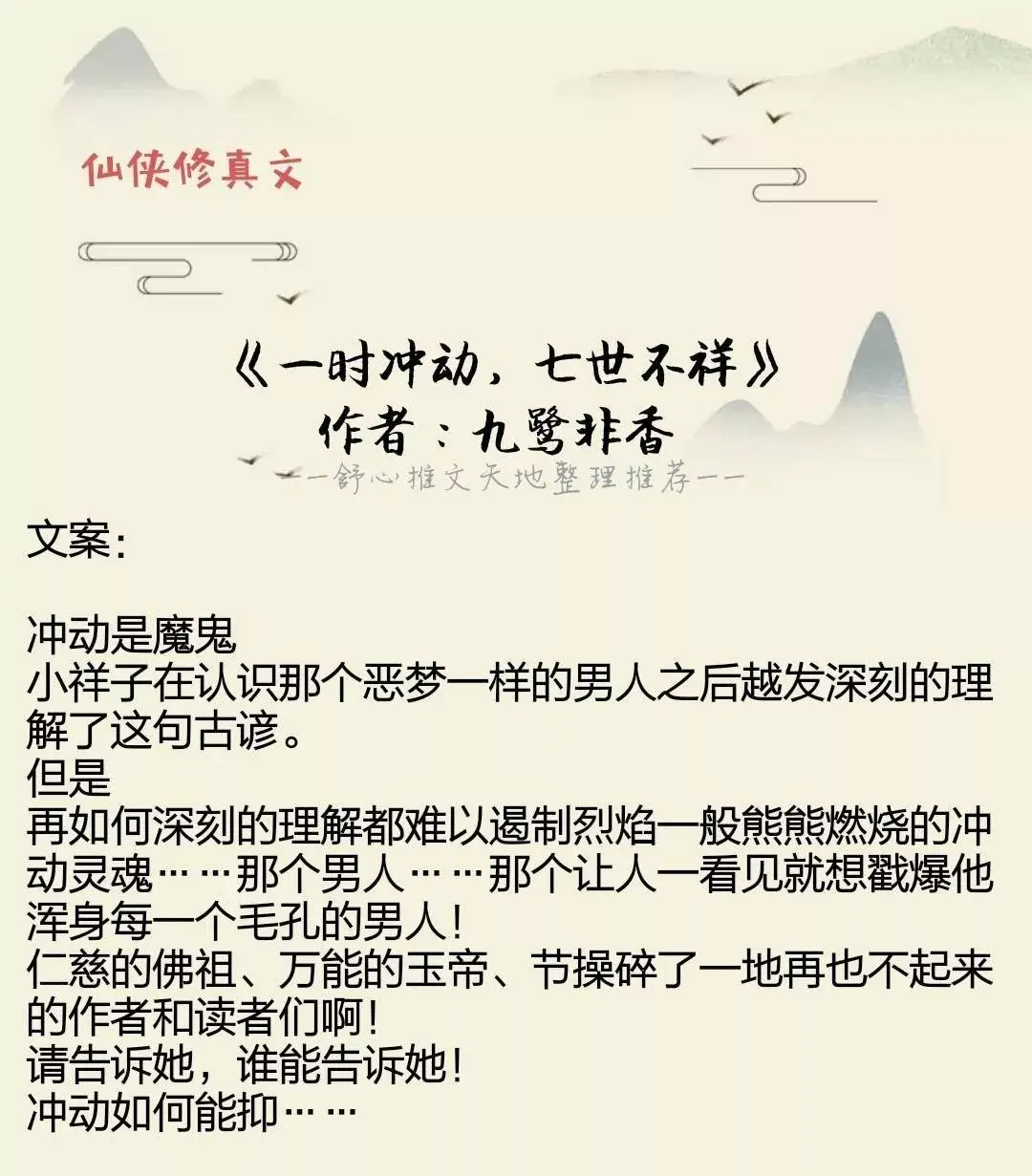 书评:我又来推荐九鹭非香的文了,提到仙侠,她的文几乎必推吧。前两天刚推荐了几部,这部属于欢快型,有点快穿的感觉。欢喜冤家男女主,斗着斗着就爱上了。其实第一世刚开始看的时候,还没什么感觉,就觉得男女主斗气挺逗的,越往后看越放不下。这篇文的文风很轻松欢快,跟她的其他几部甜虐的风格不同。