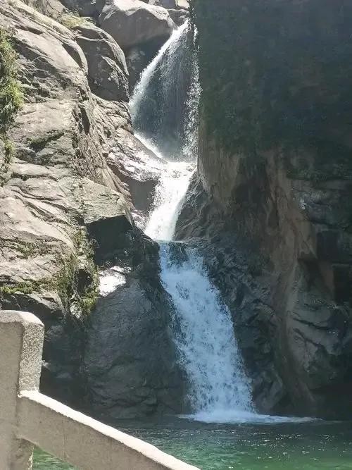 出谷远眺有“天柱峰”、“宰相石”,前方忽有水声澎湃如潮,转过山崖便见一瀑布分三折渲滞而下,轰鸣震荡,这就是著名的九水“潮音瀑”。