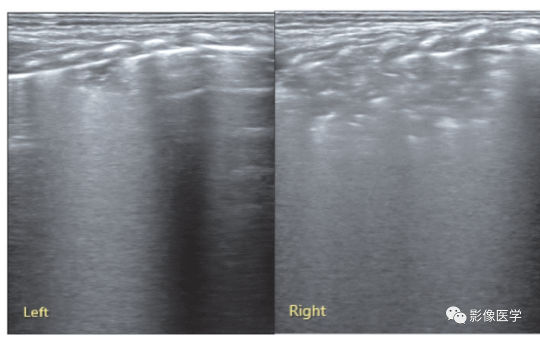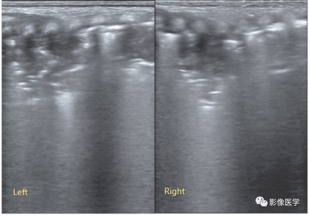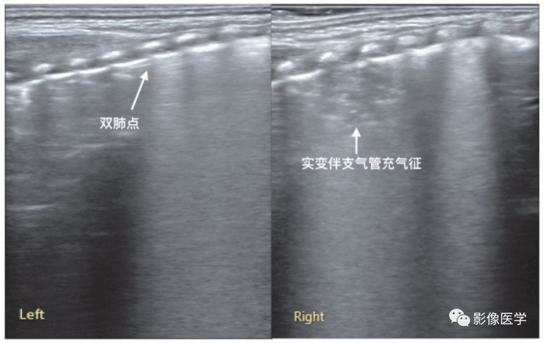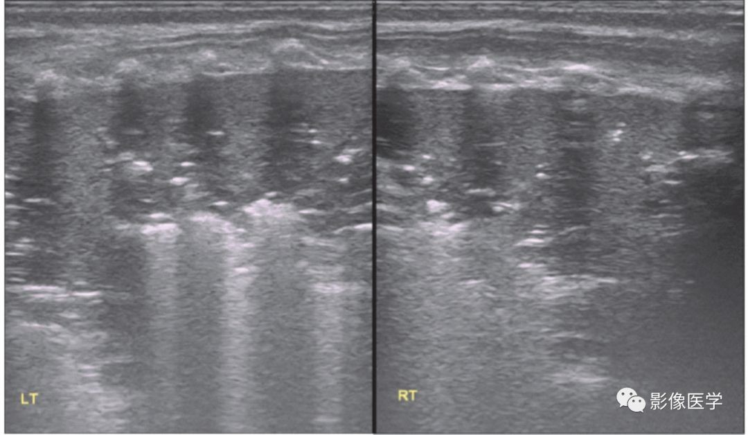 胎龄33周,低出生体重,出生后33d,因胃食管反流致乳汁吸入后呼吸困难。肺脏超声显示双肺实变伴支气管充气征,右肺实变范围较大,左肺实变仅累及1个肋间,实变区边缘不规则,部分肋间胸膜线消失或模糊,A线消失。