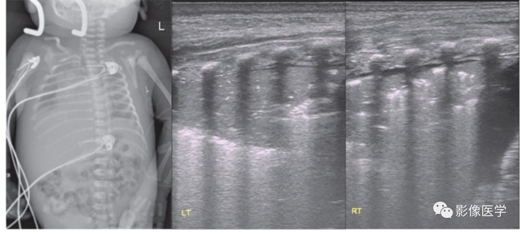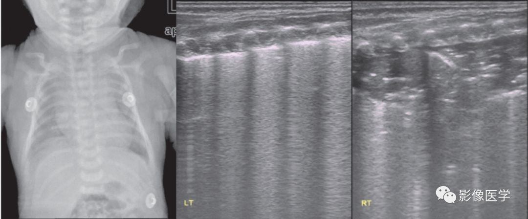 G4P2,胎龄33周,自然分娩。因咳嗽1周、喘憋5d于出生后45d入院。查体:呼吸困难,三凹征(+),右肺密集湿啰音,给予呼吸机治疗。肺脏超声:左肺呈AIS改变(胸膜线模糊,A线消失);右肺大面积实变伴支气管充气征,边界不规则,提示为肺炎。